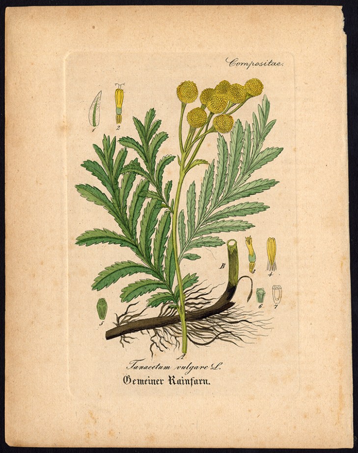 In the handpainted 1913 book The Language of Flowers, tansy means: “I declare war against you”. Tennessee whiskey baron Jack Daniel liked his drink with a little sugar and crushed tansy leaf. Lest ye want to imitate the great Mr. Jack, please beware for one leaf too many brings toxic consequences.