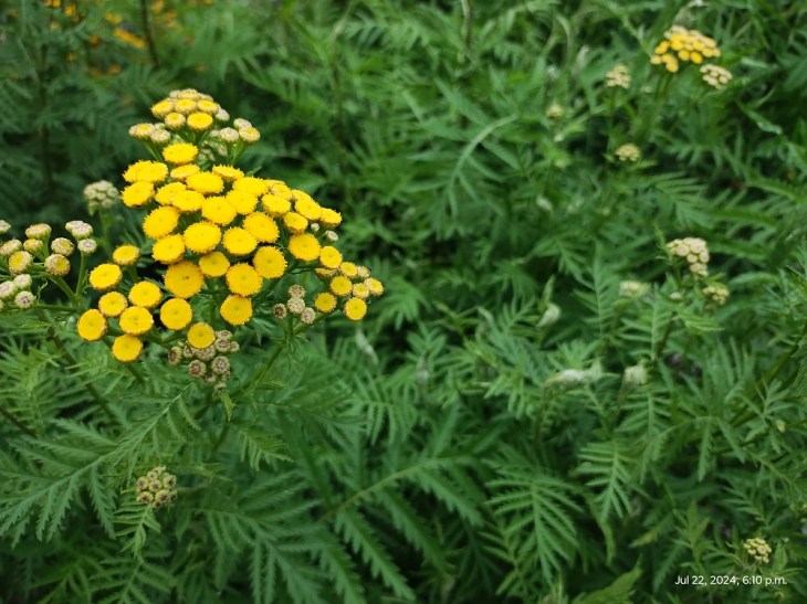 Medicinal and culinary use of tansy goes back as far as history does. The flowers also give a strong yellow dye. The first president of Harvard’s coffin was packed with tansy, a common embalming aid in colonial New England. After its introduction by Europeans, wreaths of tansy leaves and flowers were worn by Native Americans to ward off various diseases and parasites. Settlers preferred to put it in their shoes, for the same reason.